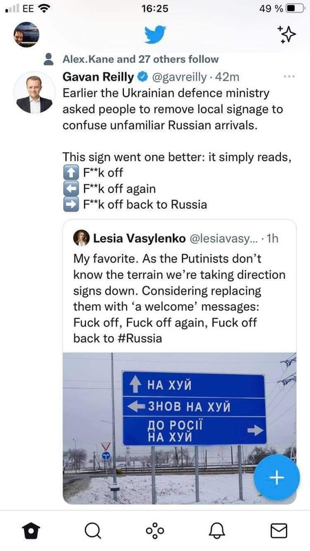Related: Editorials & Other Articles, Issue Forums, Alliance Forums, Region ForumsUkrainians taking down road signs to misdirect Russians. Overhead sign says "Go ____ Yourselves"