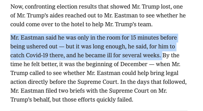 Per this Times story, Eastman also got pretty sick from Covid in Nov. 2020: https://www.nytimes.com/2021/10/02/us/politics/john-eastman-trump-memo.html