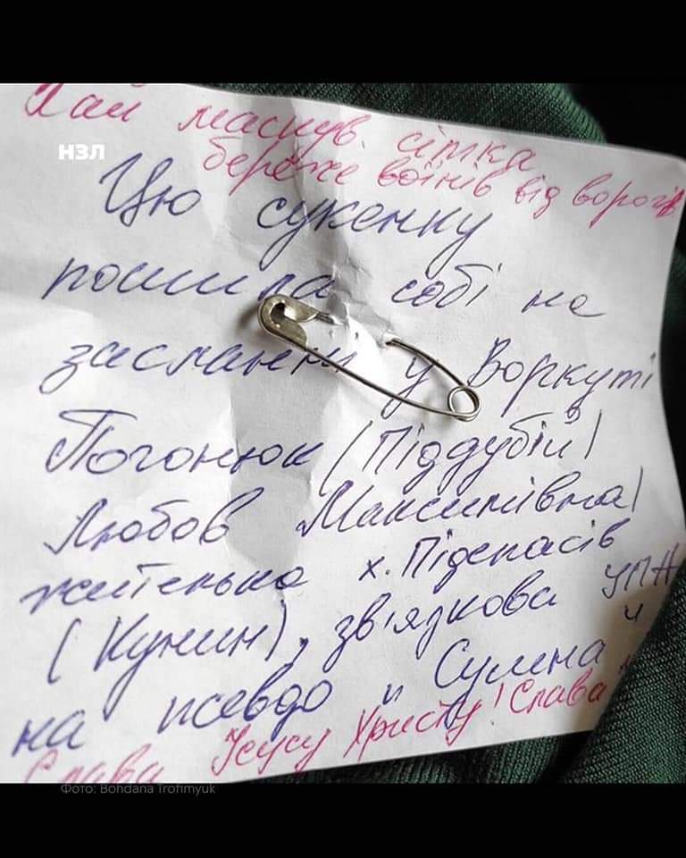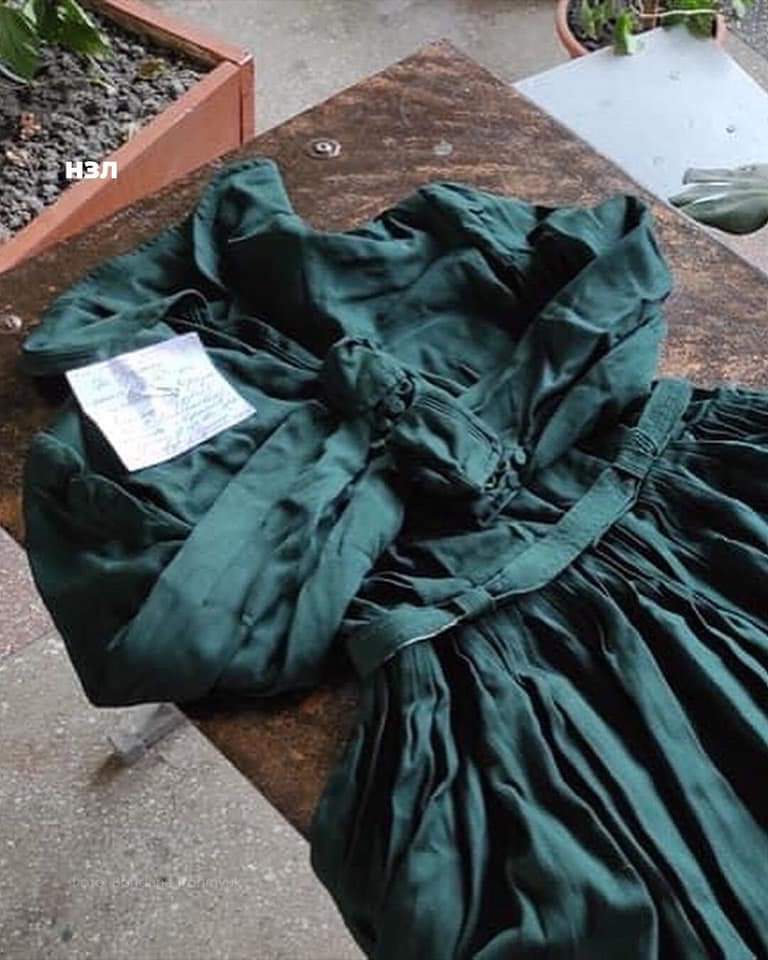 91-year-old Liubov Pahoniuk brought volunteers her dress, which she sewed during exile in Vorkuta, to create a camouflage net for Ukrainian soldiers. Volunteers saved this dress and will donate it to the museum.