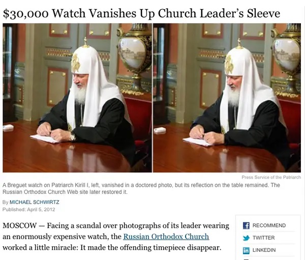 Here's a photo of Kirill, the head of the Russian Orthodox Church, who just recently justified the invasion of Ukraine because of... (checking notes and sighing) gay rights. You see, they forgot to photoshop the 30,000 dollar watch off the reflection.