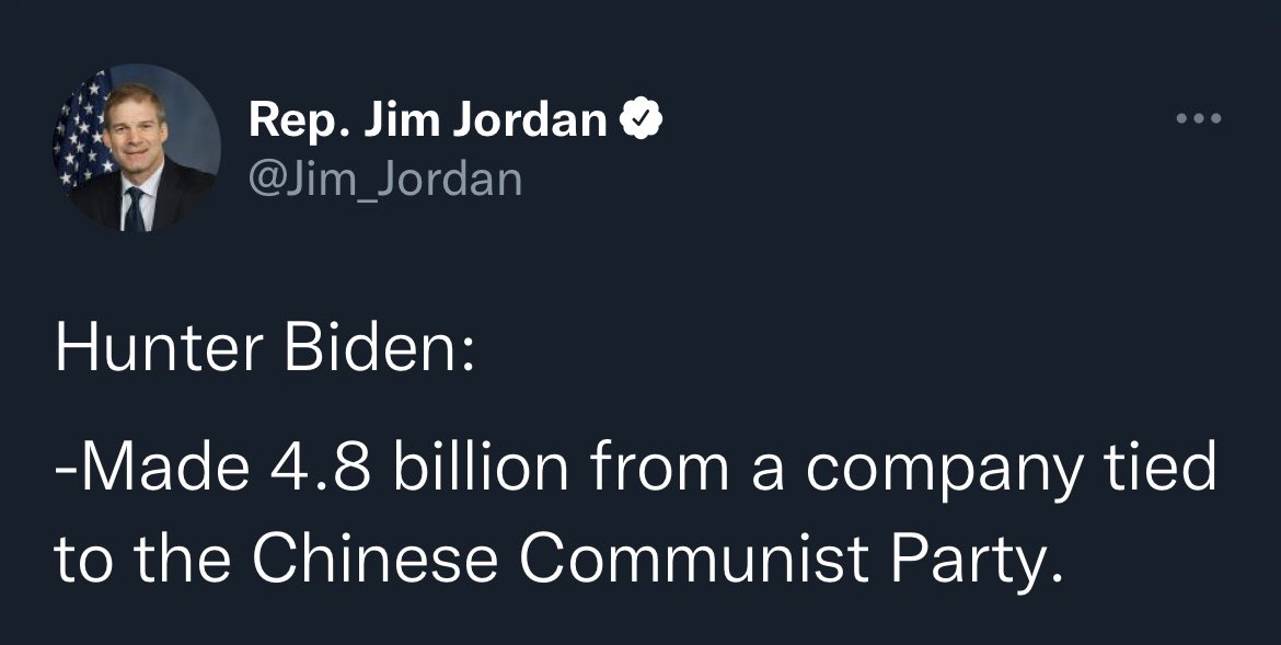 Related: Editorials & Other Articles, Issue Forums, Alliance Forums, Region ForumsGym Jordan claims Hunter Biden got $4.8 *billion* from a CCP-linked Chinese company.