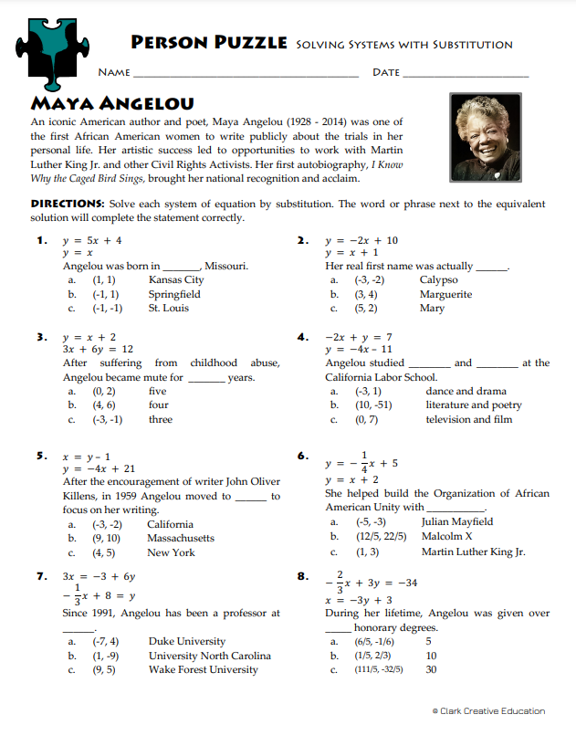 The math Person Puzzle features biographical facts about the poet Maya Angelou, who died in 2014. The worksheet mentions sexual abuse and prostitution.