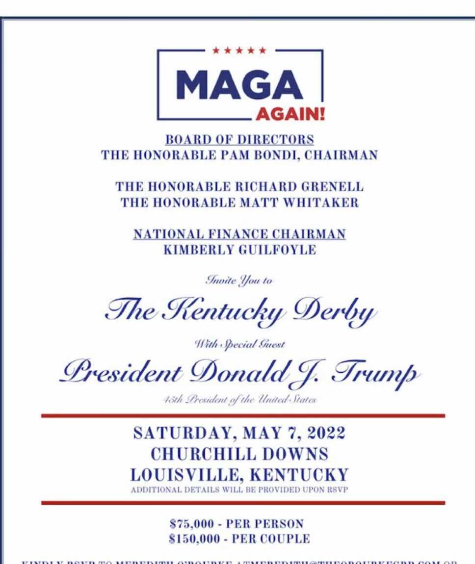 (54,005 posts)"Every year, many high profile individuals choose to attend the Kentucky Derby, including prominent political figures," Churchill Downs' senior director of communications, Darren Rogers, told The Courier Journal Thursday evening. "We do not comment on or confirm the attendance of individual guests or those holding private events not coordinated by Churchill Downs."