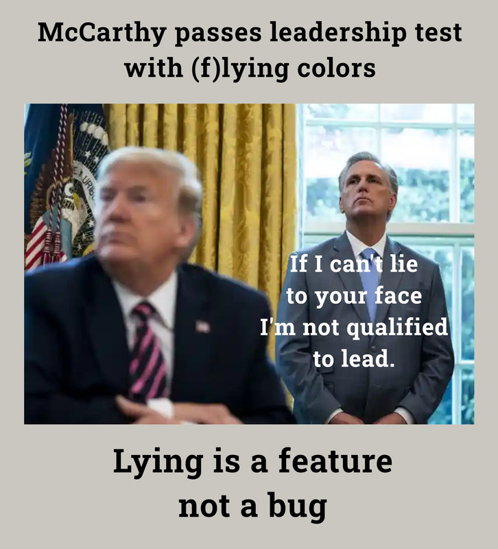 The pundits on MSNBC were saying that McCarthy couldn't lead the Republicans after being caught in such a flagrant lie. Maybe the Republicans scapegoat him in a mock display of conscience, but maybe not. When Trump doubled down on his lies, the same Republicans trampled each other in the rush to fall into line. McCarthy just established serious liar cred.