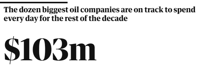 The fossil fuel industrys short-term expansion plans involve the start of oil and gas projects that will produce greenhouse gases equivalent to a decade of CO2 emissions from China, the worlds biggest polluter. These plans include 195 carbon bombs, gigantic oil and gas projects that would each result in at least a billion tonnes of CO2 emissions over their lifetimes, in total equivalent to about 18 years of current global CO2 emissions. About 60% of these have already started pumping. The dozen biggest oil companies are on track to spend $103m a day for the rest of the decade exploiting new fields of oil and gas that cannot be burned if global heating is to be limited to well under 2C.
