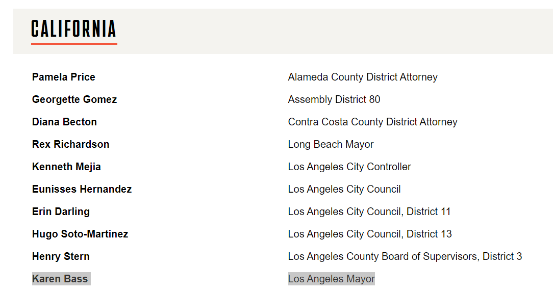 I can assure you that Karen Bass has nothing similar in her platform. The two are not analogues of each other.