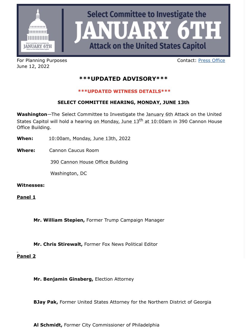 NEW: Trump 2020 campaign manager Bill Stepien will testify at the January 6th committee hearing on Monday.