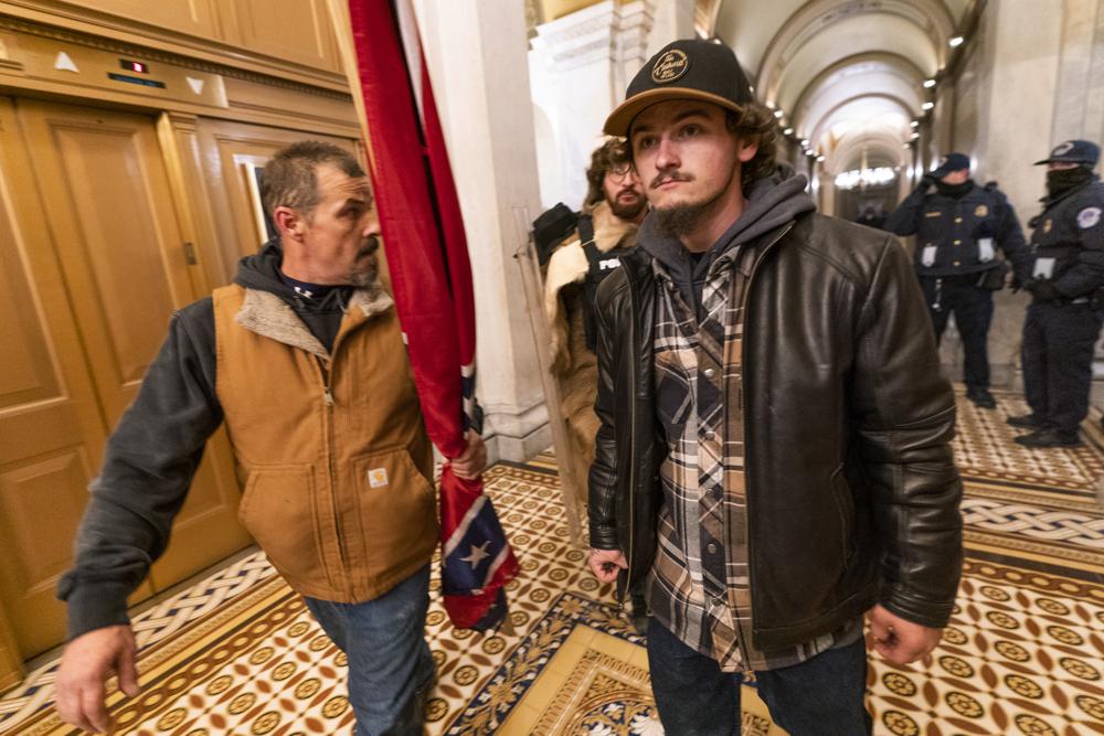 FILE - Insurrectionists loyal to President Donald Trump, including Kevin Seefried, left, walk on a hallway after a confrontation with Capitol Police officers outside the Senate Chamber inside the Capitol, Jan. 6, 2021 in Washington. A federal trial is scheduled to start on Monday, June 13, for Seefried and his son Hunter who have been charged with storming the U.S. Capitol together. (AP Photo/Manuel Balce Ceneta, File)