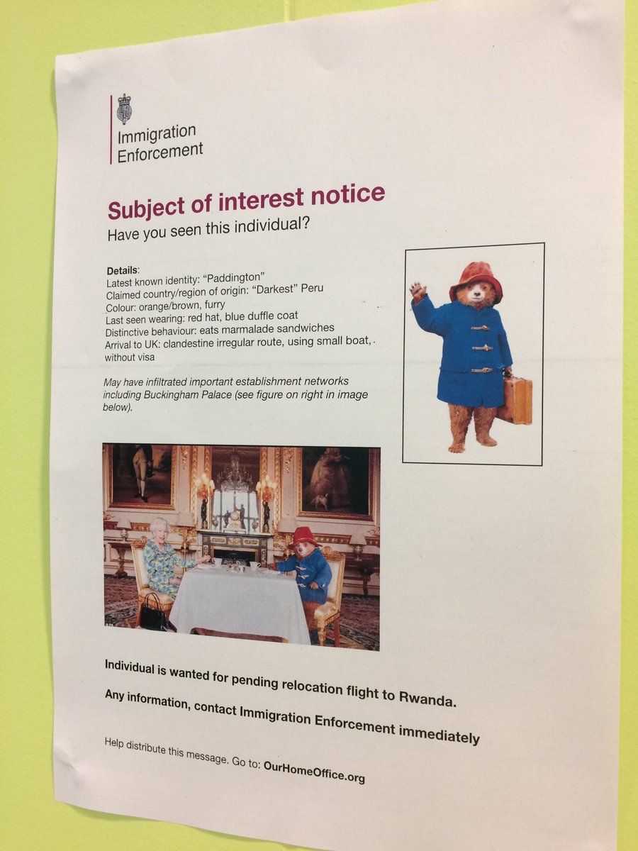Over the past week mocked up immigration enforcement notices have begun to appear on internal Home Office staff noticeboards, featuring photographs of Paddington Bear, stating that he is wanted so he can be placed on a relocation flight to Rwanda.