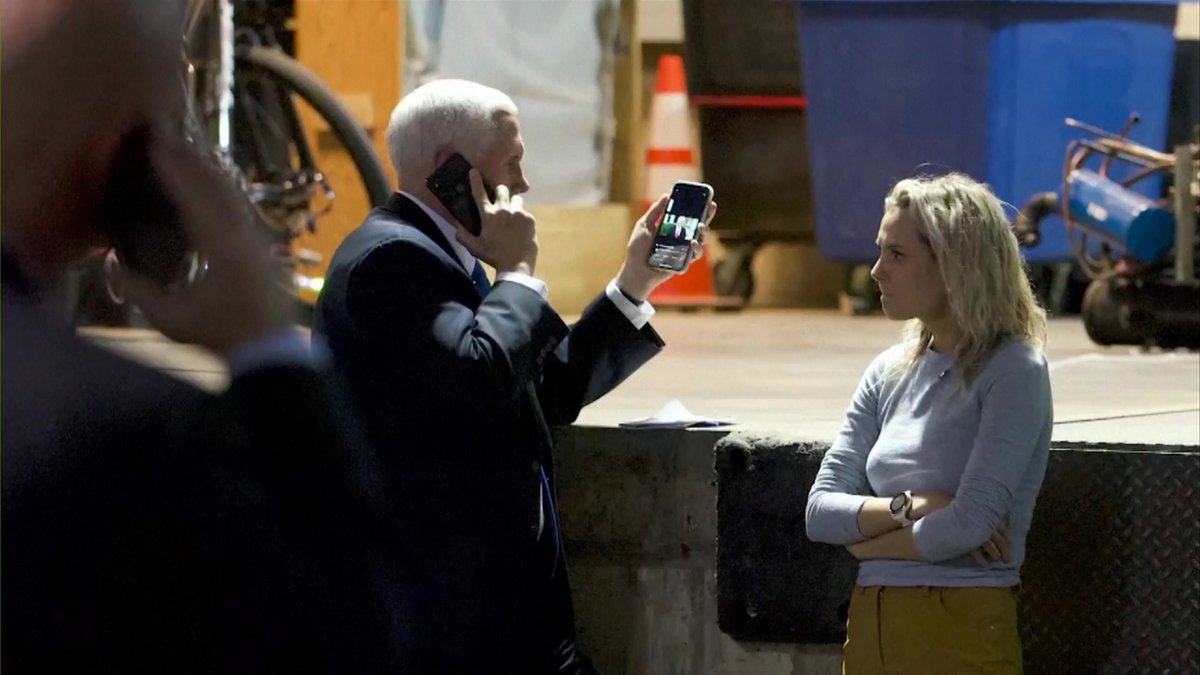 Robert Mackey @RobertMackey 3mJan 6 select committee releases photo of Pence in Capitol basement, after he refused to get in limousine because he feared Secret Service would evacuate him against his will, watching Trump's tweeted video praising the rioters who had stormed the Capitol