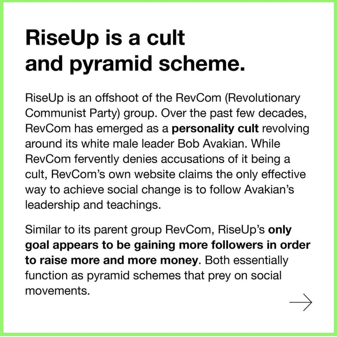 RiseUp is an offshoot of the RevCom (Revolutionary Communist Party) group. Over the past few decades, RevCom has emerged as a personality cult revolving around its white male leader Bob Avakian. While RevCom fervently denies accusations of it being a cult, RevComs own website claims the only effective way to achieve social change is to follow Avakians leadership and teachings. Similar to its parent group RevCom, RiseUps only goal appears to be gaining more followers in order to raise more and more money. Both essentially function as pyramid schemes that prey on social movements.