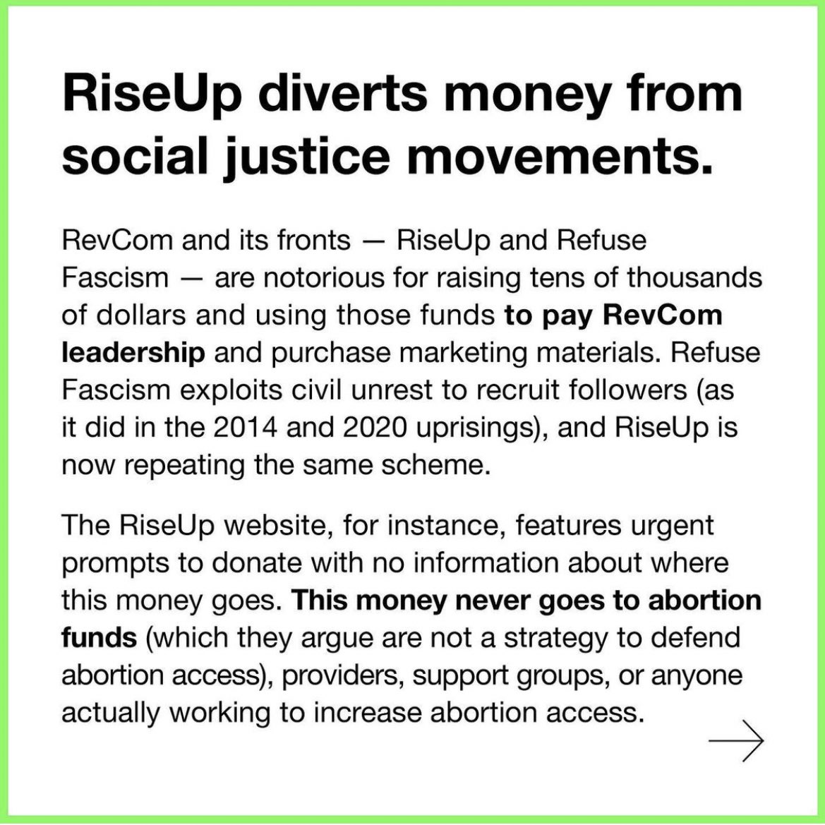 RevCom and its fronts RiseUp and Refuse Fascism are notorious for raising tens of thousands of dollars and using those funds to pay RevCom leadership, and to purchase marketing materials (to raise even more money). Refuse Fascism exploits civil unrest to recruit followers (as it did during the 2014 and 2020 uprisings), and RiseUp is now repeating the same scheme. The RiseUp website, for instance, features urgent prompts to donate with no information about where this money goes. What we do know is that this money never goes to abortion funds (which they argue are not a strategy to defend abortion access), providers, practical support groups, or anyone actually working to increase abortion access.