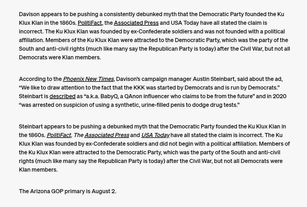 https://www.phoenixnewtimes.com/news/republican-congressional-candidate-jerone-davison-calls-democrats-klansmen-in-new-campaign-ad-13981291