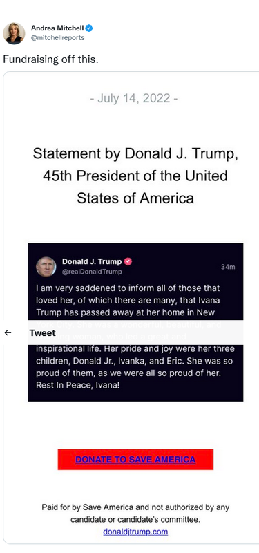 (3,234 posts)Trump fundraising off Ivana's death or people following Andrew Mitchell on Twitter.