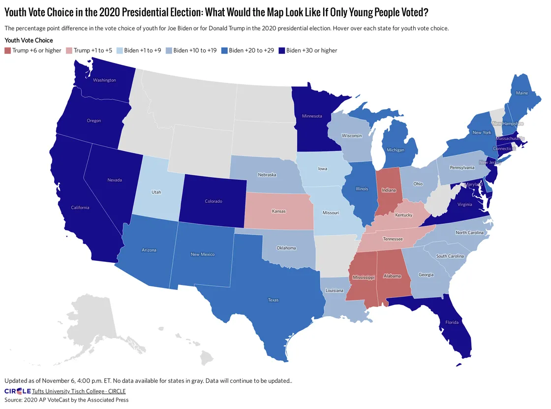 Over half of all voters under the age of 30 voted in the 2020 elections, a record figure, according to data from the Center for Information and Research on Civic Learning and Engagement at Tufts University. The surge in turnout greatly benefited President-elect Joe Biden, who won this demographic by 24 points (60%-36%) over President Donald Trump.