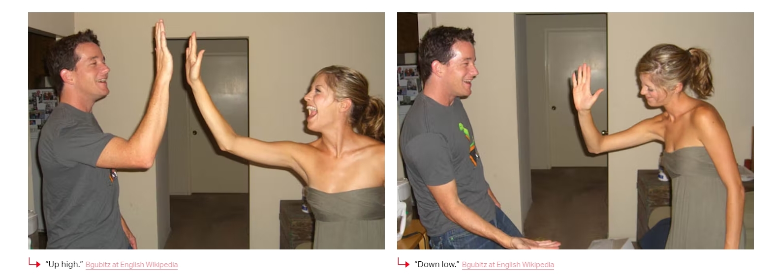 A quick search of high five wikipedia photo shows that the images are an object of fascination for many others besides me. People around the world have noted that the pair looks a lot like Rachel and Chandler from Friends. But not everyone is a fan. In 2020, one particularly passionate Wikipedia user named Kugihot suggested the photos be removed because they were simply a waste of precious Wikipedia public bytes.
