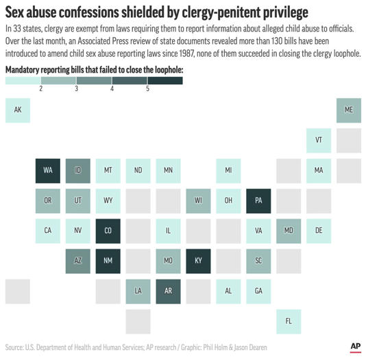In 33 states, clergy are exempt from any laws requiring professionals such as teachers, physicians and psychotherapists to report information about alleged child sexual abuse to police or child welfare officials if the church deems the information privileged.