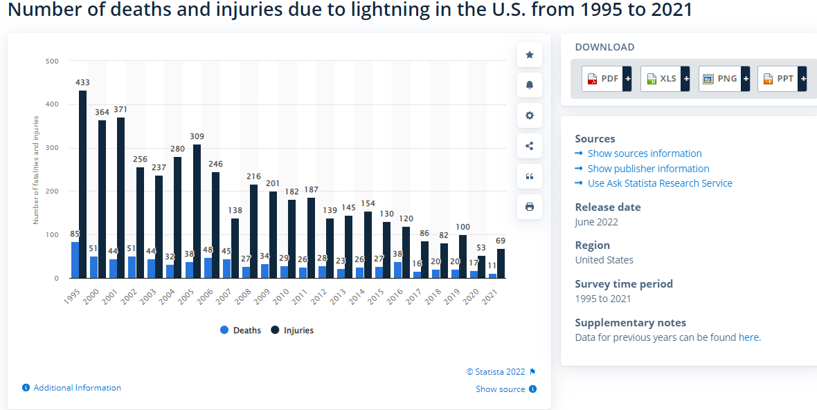 https://www.statista.com/statistics/203715/injuries-and-fatalities-caused-by-lightning-in-the-us/#:~:text=Lightning%20damage%20in%20the%20U.S.%20%2D%20number,fatalities%20and%20injuries%201995%2D2021&text=In%202021%2C%20there%20were%20a,reported%20due%20to%20lightning%20nationwide.