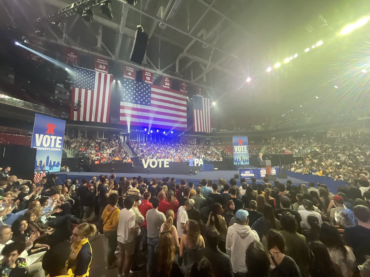 The view inside Temple Universitys Liacouras Center in Philadelphia where President Biden and former President Obama reunite for a Pennsylvania Democrats grassroots rally.