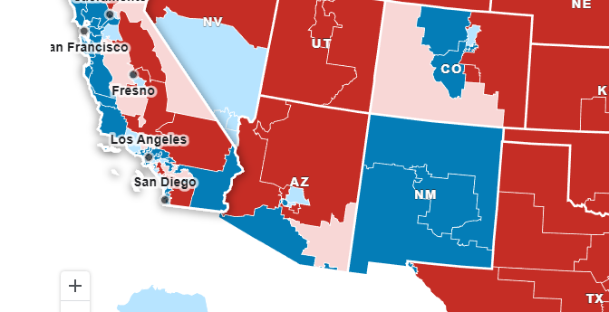 But those raw numbers are misleading: Most of the yet-to-be-decided districts are out West read: Arizona, California, Nevada, Oregon and Washington where the vote counting is slower, and most lean blue. That region has upward of 10 clearly blue seats that dont have enough votes in to be called, but are very unlikely to flip. And several others lean blue.