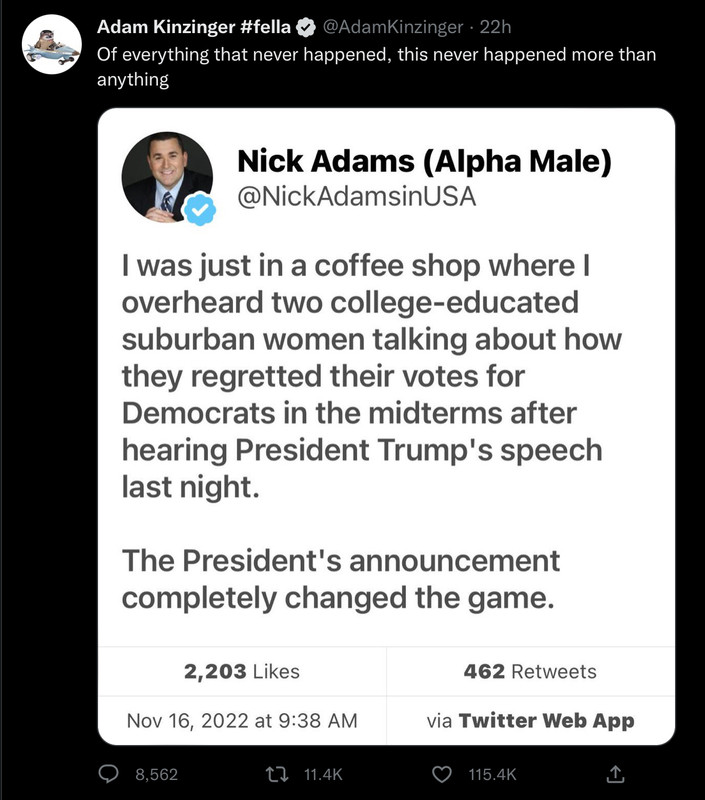 (14,743 posts)The two "College educated' (They were showing everybody their diplomas), "Suburban women" (and talking about their addresses) told "Nick Adams" if they would do a threesome if he could mansplain more about how badly they had voted.