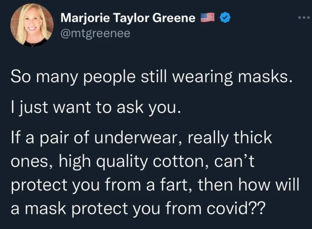Related: Editorials & Other Articles, Issue Forums, Alliance Forums, Region ForumsMTG - equating masking for Covid/masking for farts