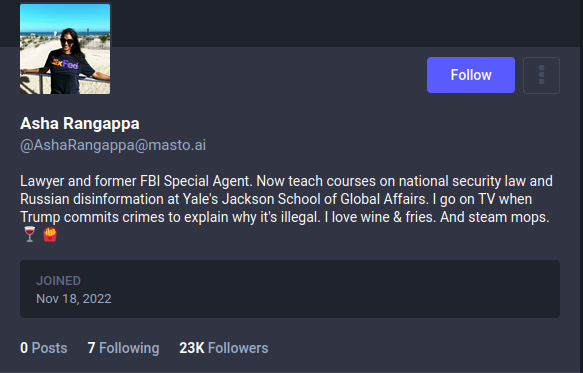 (3,748 posts)(Im not good w internet stuff). I have a question: how can you tell when an account is not fake? On twitter, they have that blue mark. What do they have on mastadon? For example, I want to follow asha rangappa. How do I know which one is her account? I am trying to find people to follow right now.