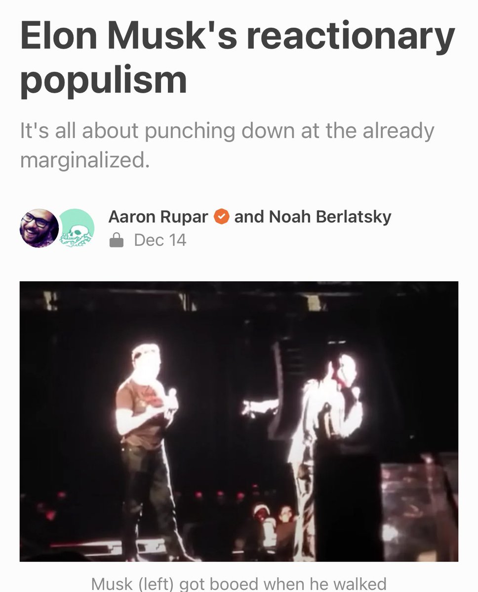 EDITING to add the possible reason...and I'm editing what I'd added after discovering in the preview that the tweet from a liberal podcaster was just deleted by the podcaster. Probably because Musk is suspending journalists who criticize him. But I will leave the image of the Substack article Rupar published yesterday that apparently offended Musk.