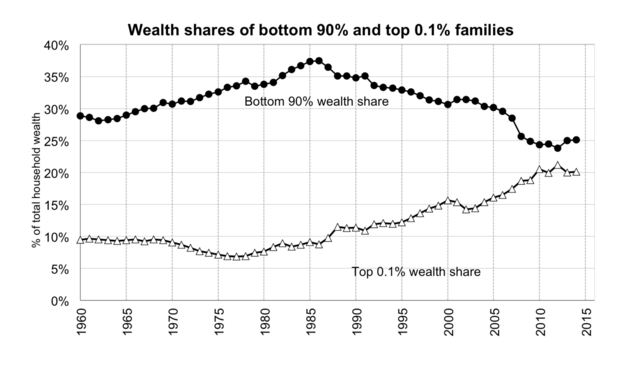 "The result is an extreme concentration of wealth not seen in any other leading economy. The 400 richest Americans currently own more wealth than all Black households and a quarter of Latino households combined. According to an analysis from economists Emmanuel Saez and Gabriel Zucman from the University of California-Berkeley, the richest top 0.1% has seen its share of American wealth nearly triple from 7% to 20% between the late 1970s and 2016, while the bottom 90% has seen its share of wealth decline from 35% to 25% in that same period. Put another way, the richest 130,000 families in America now hold nearly as much wealth as the bottom 117 million families combined."