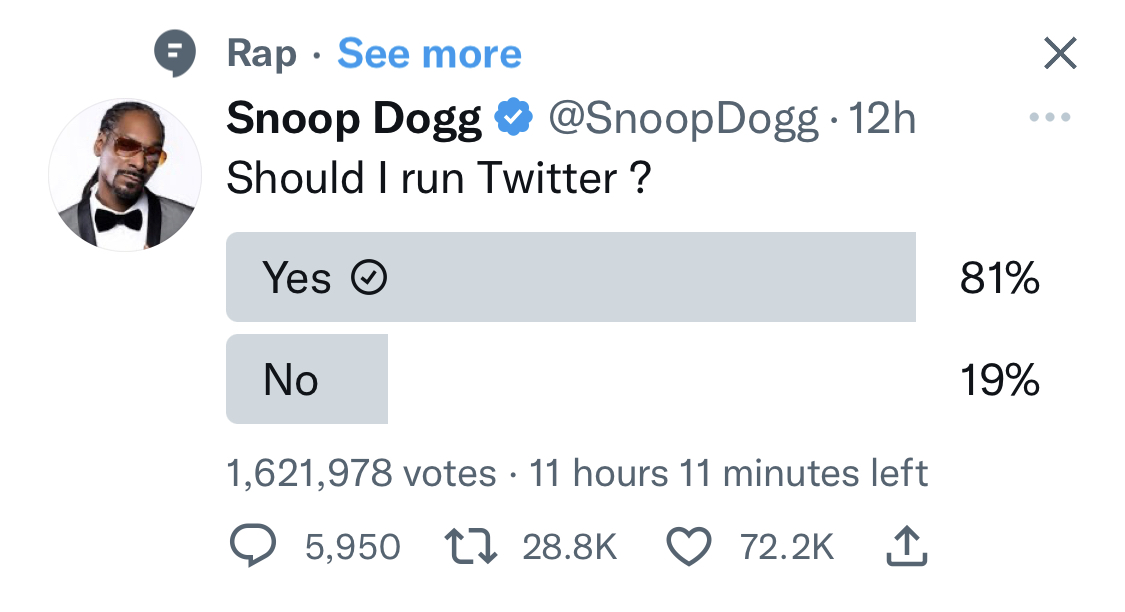 (7,839 posts)And snoop dogs silly poll, same thing the silliness is second only to hate speech on Twitter. Or maybe pet videos 🤔?