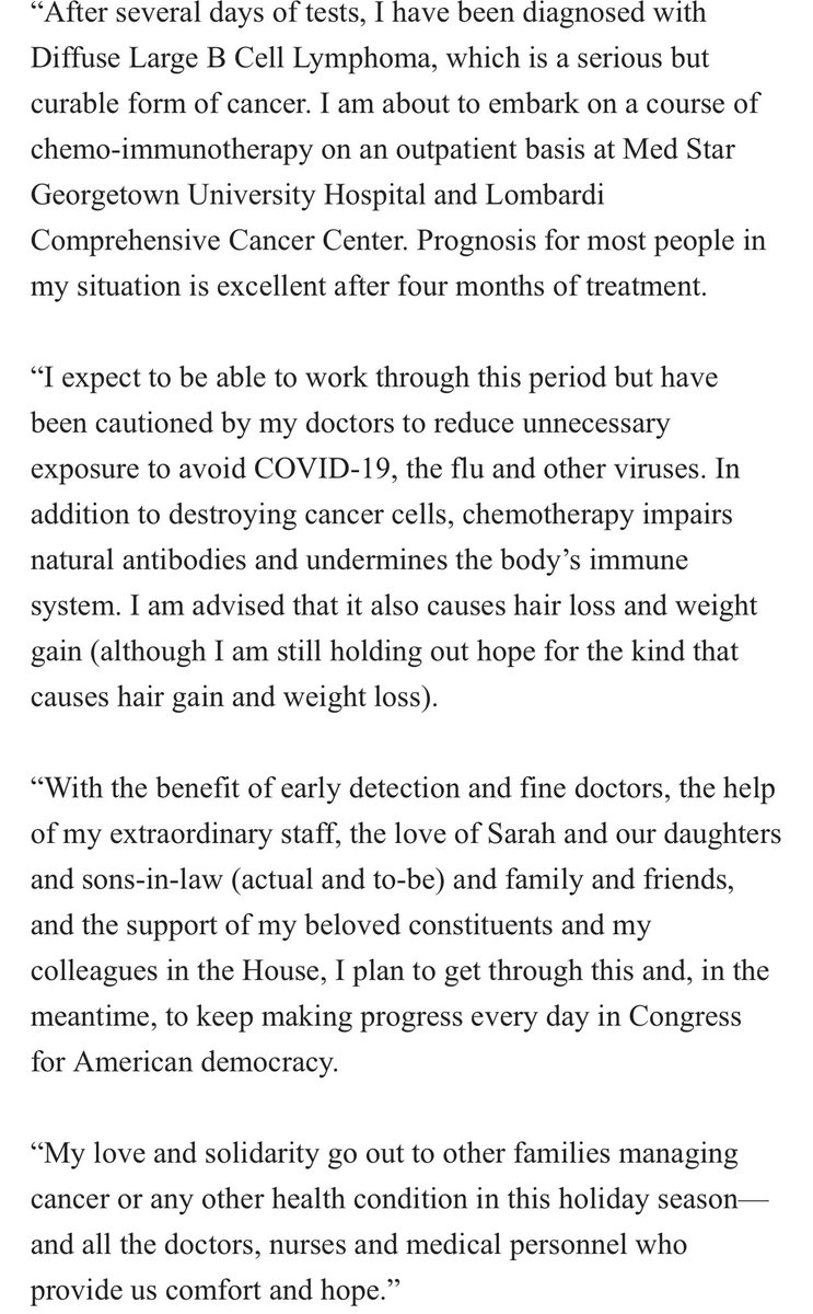 Olivia Beavers @Olivia_BeaversRep. Jamie Raskin (D-Md.) announces he has been "diagnosed with Diffuse Large B Cell Lymphoma, which is a serious but curable form of cancer."