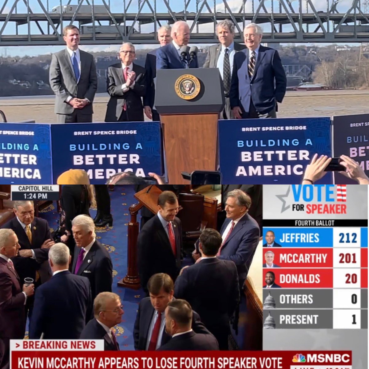 Biden, McConnell, fmr OH GOP Sen Rob Portman, KY Dem Sen Sherrod Brown, OHs GOP Gov Mike DeWine & KYs Dem Gov Andy Beshear tout bipartisan successes over the last 2 yrs as chaos grows among House GOPers blocking McCarthys speakership bid a 4th time.