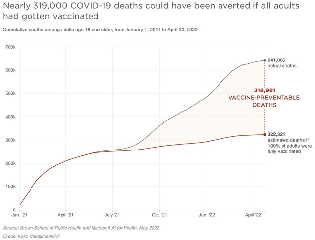 Found this article about the numbers - as of April 2022, nearly 319,000 COVID-19 deaths could have been averted if all adults had gotten vaccinated.