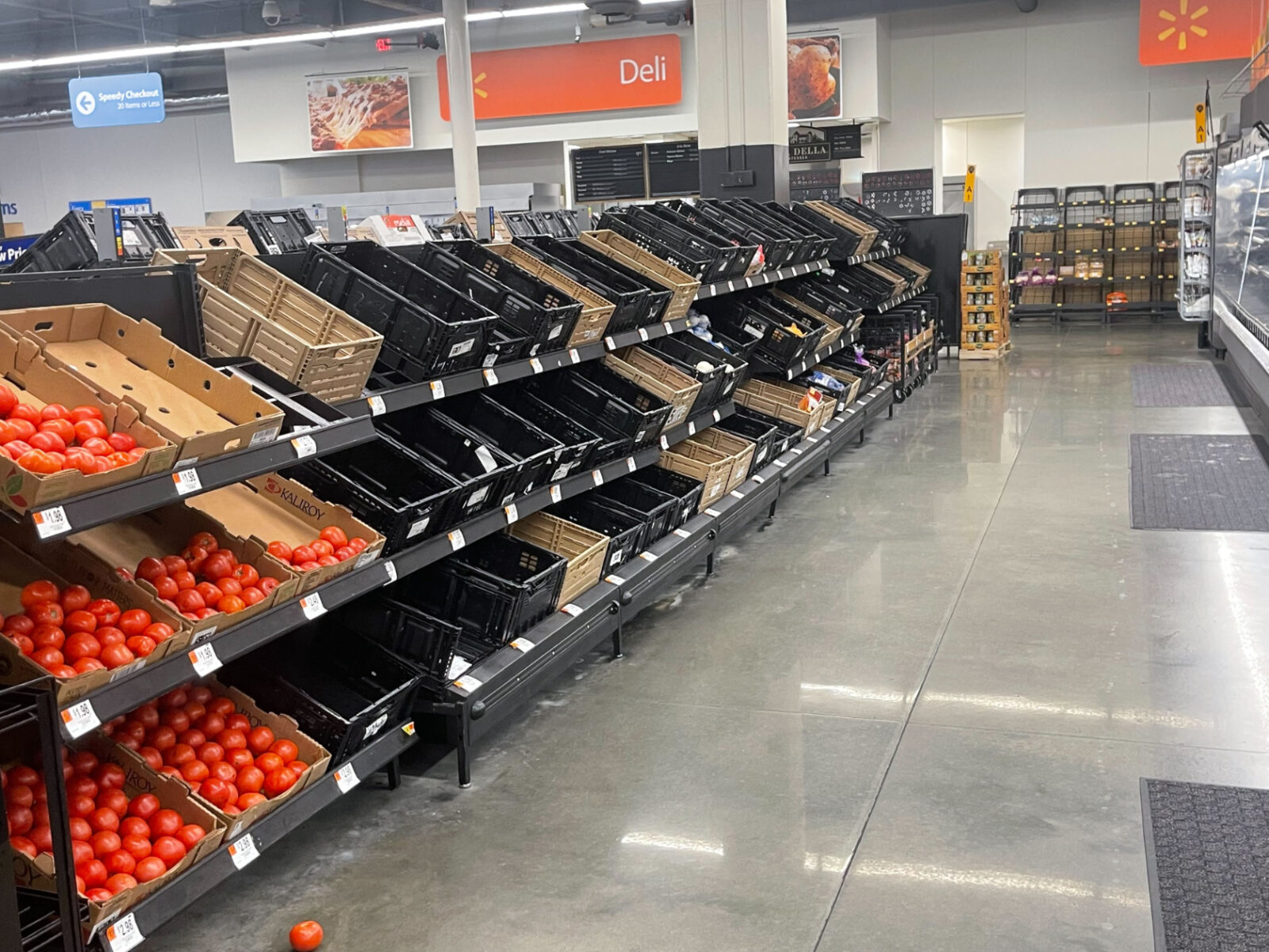On Monday, out of order signs were posted on the stores empty refrigerators and freezers. The deli was empty and closed. Produce shelves were also almost completely bare.