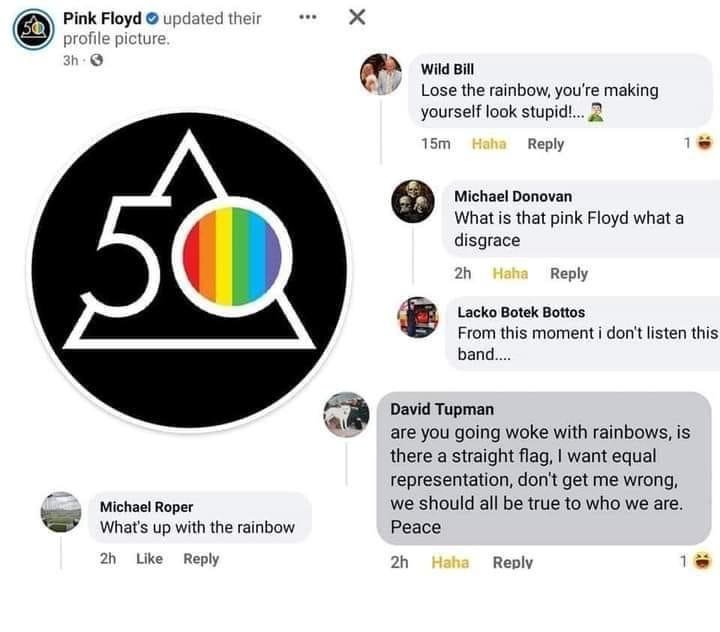 It seems that certain less... enlightened followers of the band on Facebook have interpreted the new logo's inclusion of red, orange, yellow, green, blue and violet bars, the colours visible when white light passes through a triangular prism, as featured on the album's world-famous artwork designed by Hipgnosis, as a signal that the group are now "woke", and championing LGBTQ+ rights. And therefore, in their eyes, the group must be CANCELLED, immediately.