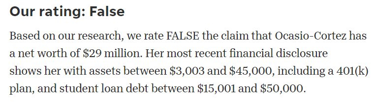 But the claim is false. Ocasio-Cortezs most recent financial disclosure, which was filed in 2021, shows her with assets between $3,003 and $45,000, including a 401(k) plan, and student loan debt between $15,001 and $50,000.