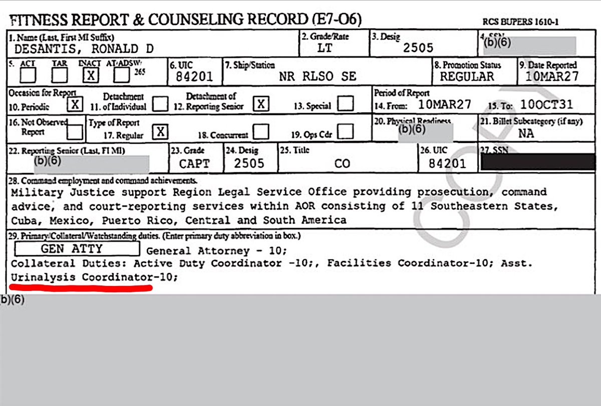 FOIA request by @JimLaPorta produces this Navy document showing DeSantis was an assistant urinalysis coordinator in the Navy. Not a fighter pilot, as he claimed.