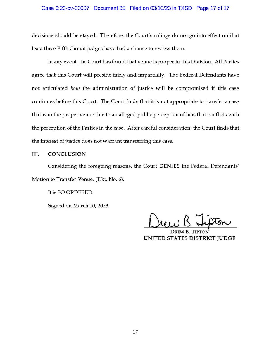 Judge Tipton has *denied* DOJ's motion to transfer Texas's challenge to the new immigration parole policy to a different district/division.