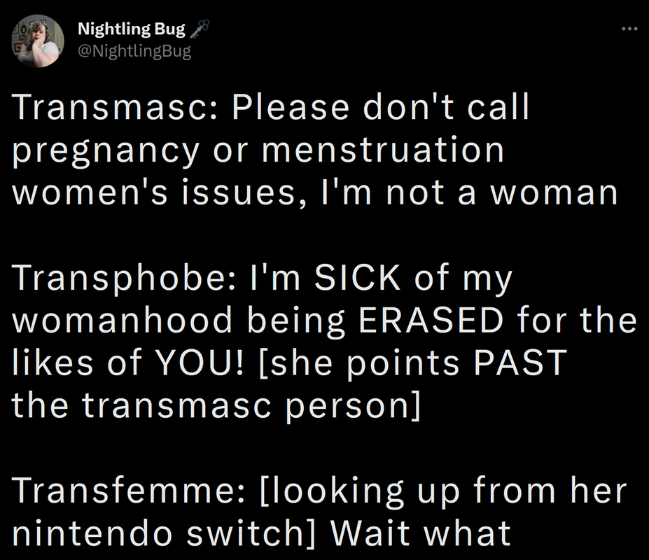 I'm a woman. Please don't ever refer to me as a person with a uterus, birthing person, or person who menstruates. How do people not realize how degrading this is? You can support the transgender community without doing this shit.