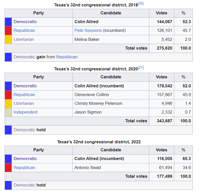 Colin Allred's father is black (he never was in his life, Colin never met him, and his father died when he was 10 years old, unbeknownst to Colin until later), his mother (whose last name is Allred) is white, and his wife is also white.