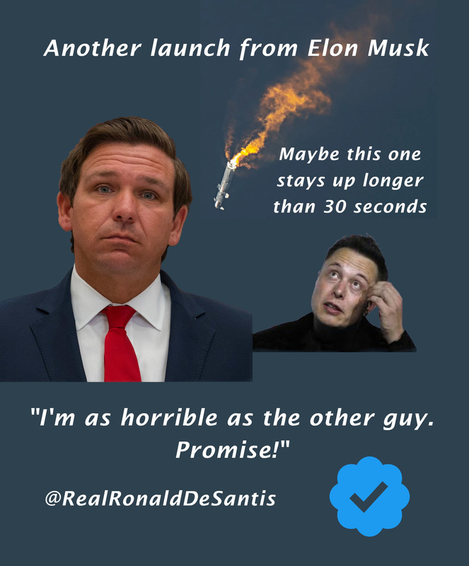 It recycles the same clips multiple times: the airboat, DeSantis' JAG headshot, Musk getting out of a truck, Musk dancing (?) and flashing his hands at the camera, Musk with a flamethrower, and a big Musk flamethrower (rocket). They had everything Musk in this video except Muskrat Love.