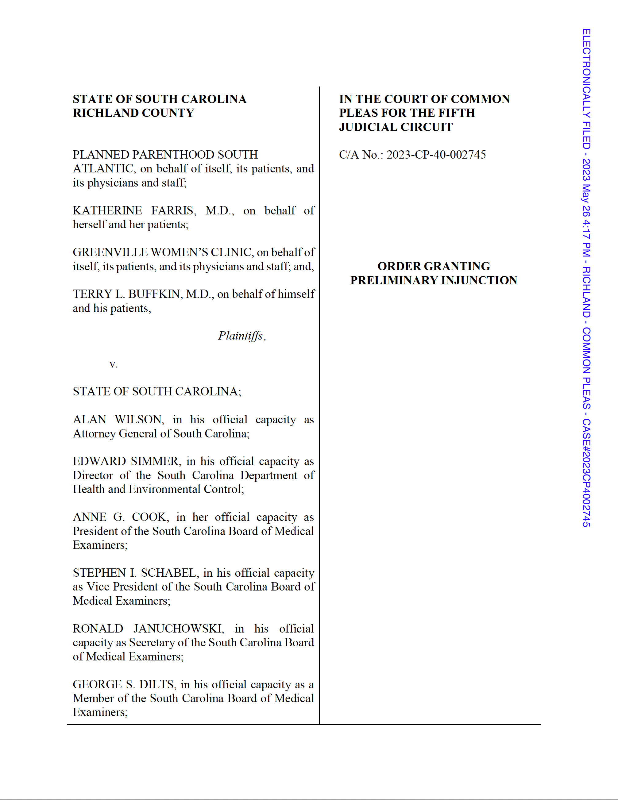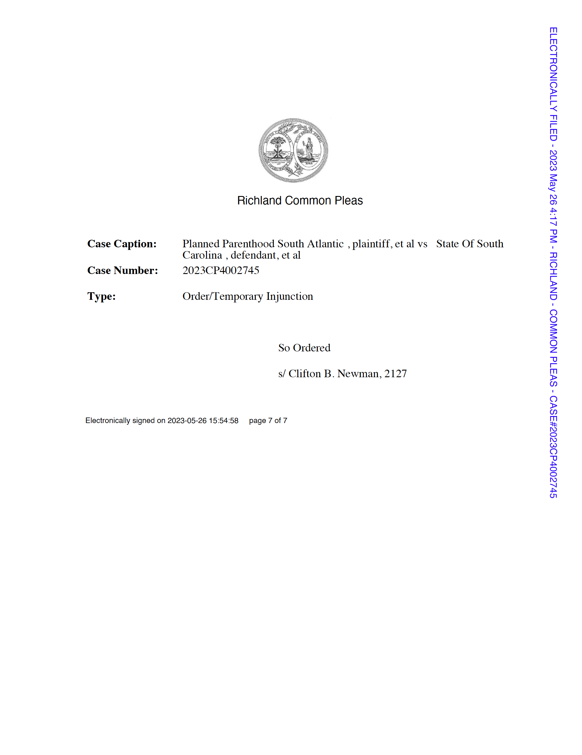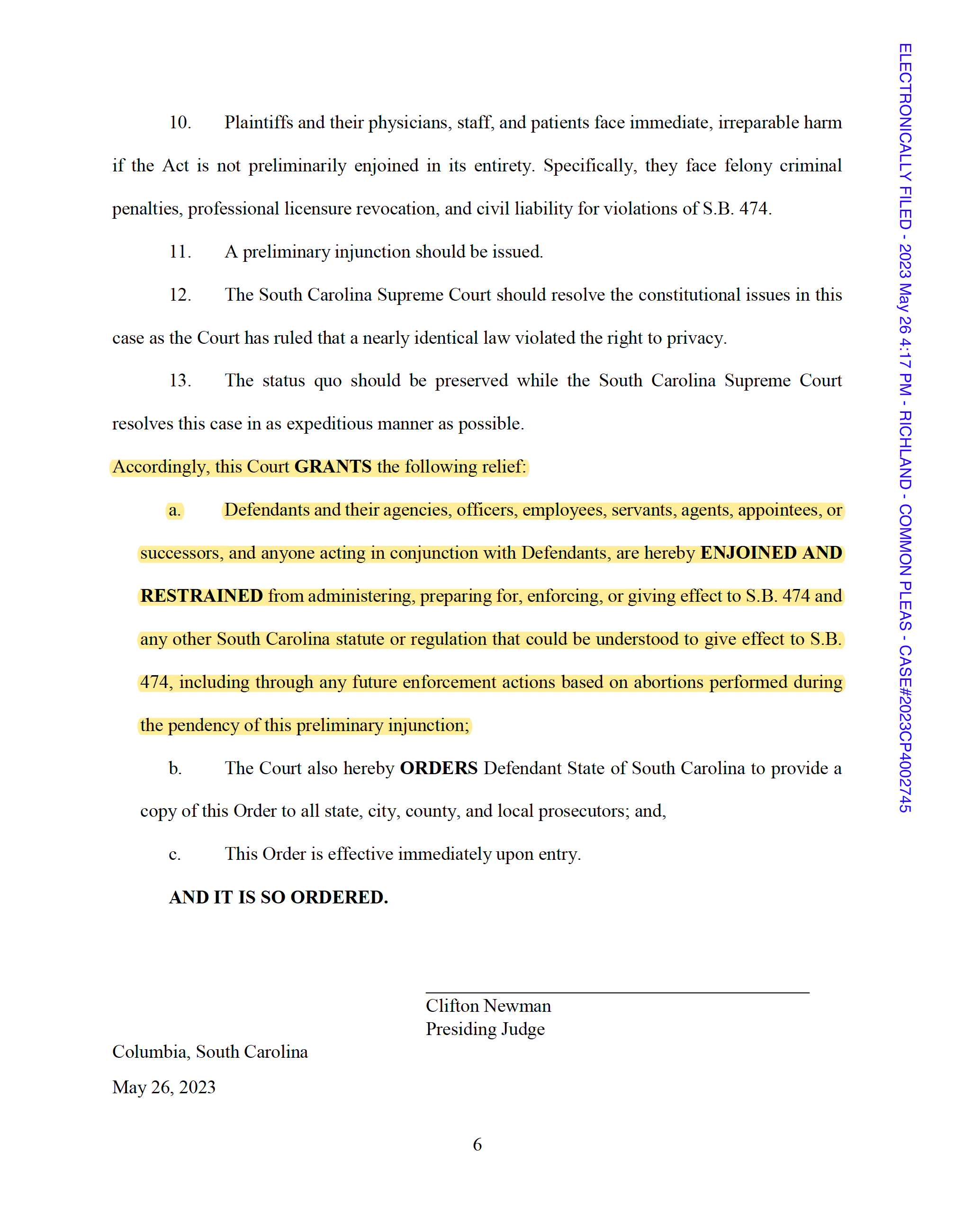 South Carolina Judge Newman's order ENJOINING enforcement of the state's abortion ban (Original Post) In It to Win It May 2023 OP