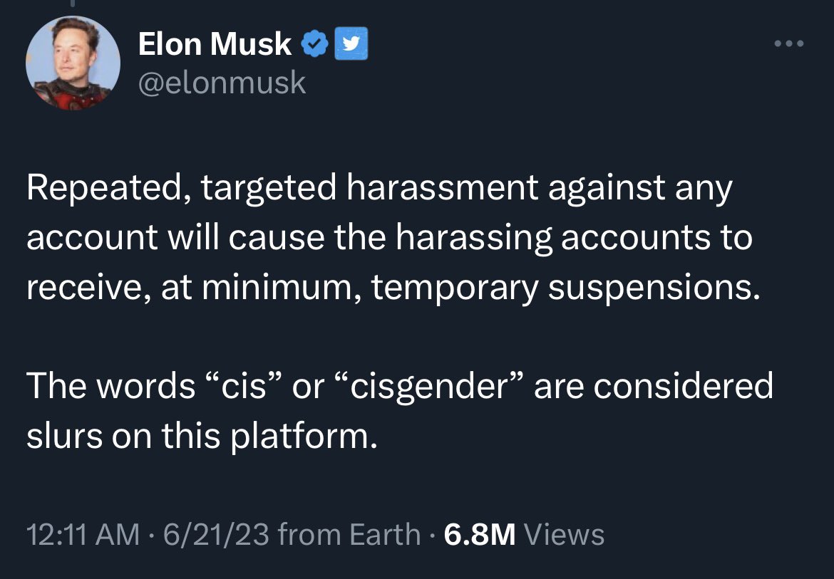 (23,715 posts)Im cis. I have referred to myself as cis. Im offended he considers that word a slur. This is why I quit twitter.