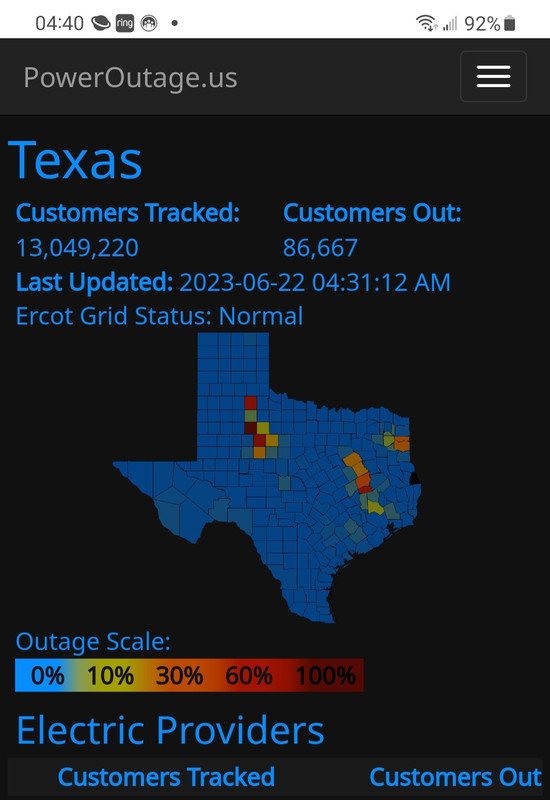 Just saw on the morning news there are outages in Texas. Found a neat website with a map. Quite a few counties having issues, some at or near 100%, at 4am. I wonder how its going to look at 12 noon.