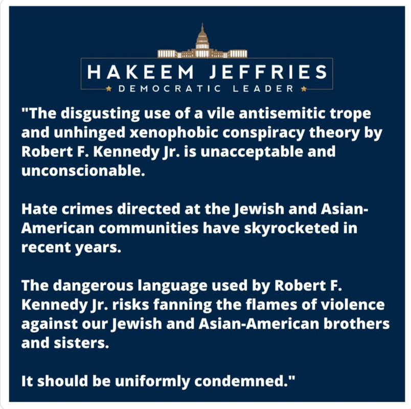 Related: Editorials & Other Articles, Issue Forums, Alliance Forums, Region ForumsHakeem Jeffries' statement on the RFK Jr.'s vile antisemitic trope and xenophobic conspiracy theory