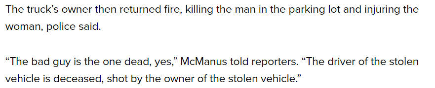 (17,151 posts)The trucks owner then returned fire, killing the man in the parking lot and injuring the woman, police said.