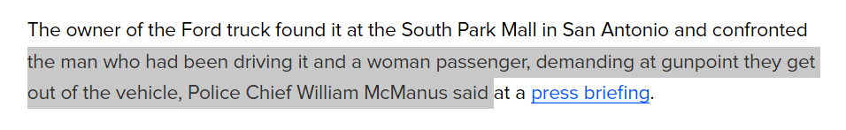 The owner of the Ford truck found it at the South Park Mall in San Antonio and confronted the man who had been driving it and a woman passenger, demanding at gunpoint they get out of the vehicle, Police Chief William McManus said at a press briefing.