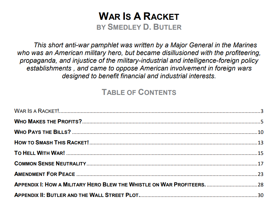 (54,294 posts)War is a racket. It always has been. It is possibly the oldest, easily the most profitable, surely the most vicious. It is the only one international in scope. It is the only one in which the profits are reckoned in dollars and the losses in lives. A racket is best described, I believe, as something that is not what it seems to the majority of the people. Only a small 'inside' group knows what it is about. It is conducted for the benefit of the very few, at the expense of the very many. Out of war a few people make huge fortunes.