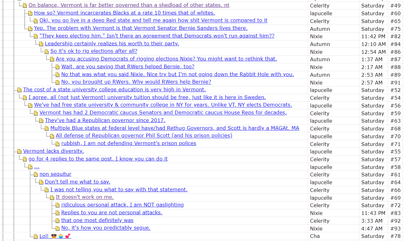 (17,984 posts)since I posted first. Is that how it works? A day later, you posted after I did and it looks like concern over a comment about Vermont which upset you.