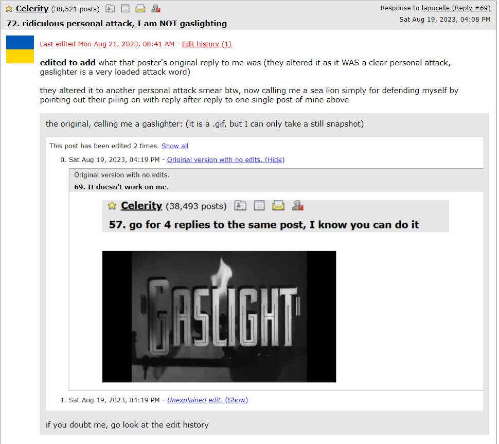 was disingenuous, as that other poster twice personally attacked me, first as a gaslighter, then (after they edited it) as a sea lion